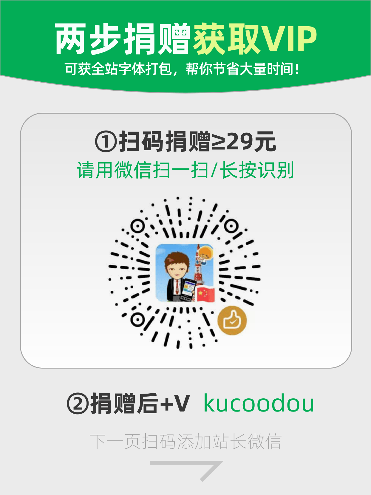 03、双赢节省成本:你用捐赠获取 VIP,能省下大量找字、整理字体的时间;我也能靠这份支持,提供更持久稳定的服务。