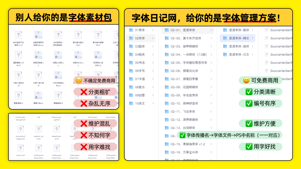 这套字体管理方案,最终确保了从:字体名称(网络传播的)→字体预览→字体文件→PS中名称,四位一体的“精准丝滑”用字体验。