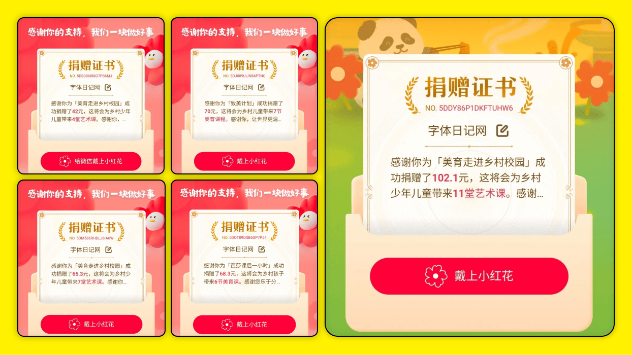 字体日记网,始终坚持“公益+服务”的建站初心,从今年5月开始,大家捐赠的部分金额,站长都会定向捐赠给腾讯公益,帮助乡村儿童美育教育。